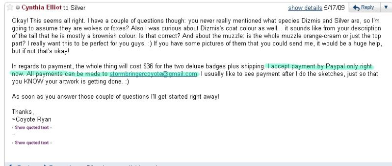 Sorry about getting the same email in there twice D: . Here he demanded that I take down my previous warning post about him as soon as I get the payment. Alarm bells, much? I told him that I will not be taking it down as that's grounds for a ban. Moreover, I think that YES, even if I get payment this DOES warrant a warning to the community! He also said that he does not want the sketches, but as I have his address I do intend on mailing them out as soon as (if) I receive what I am owed. I owe him that much and I intend that he gets what he paid for, if he does indeed pay. Part of the $17.00 is for shipping, after all.