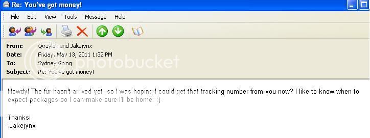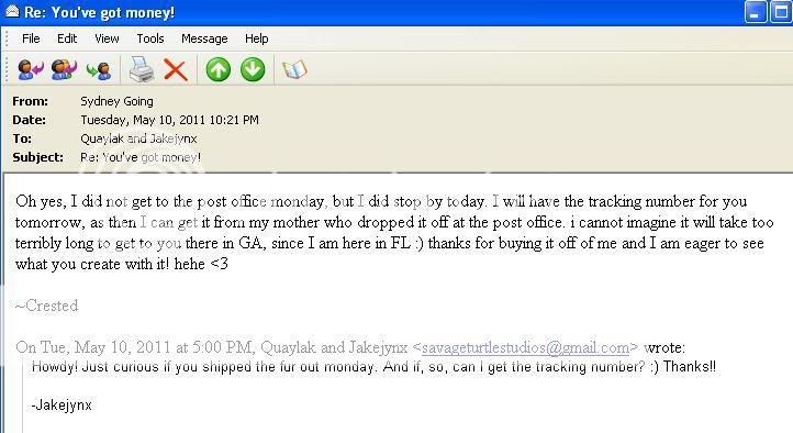 And that was the last message I received from her. I sent a final stern email on Friday, May 20 telling her that I expected either the tracking number or a refund by the end of the day on Saturday, or I would be filing a Paypal claim. I received no response. A Paypal claim was filed late Saturday night, and it was not responded to. Today I escalated it to a claim, and I'm fairly confident that I will receive a refund, given that she is apparently unable to show proof that the fur was shipped.