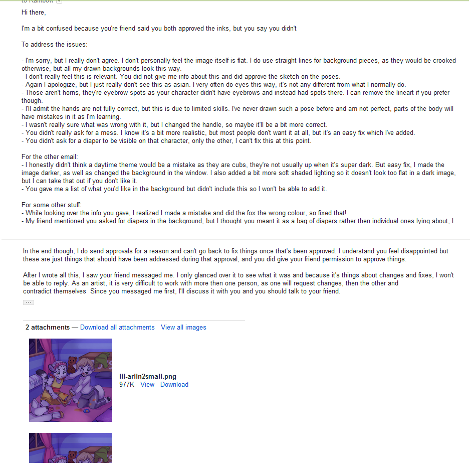 Ariin commissioned me for a picture. As I had others ahead of him, it took a bit of time before I could get to the sketch and make sure to send updates on that. On August 9th, I sent the sketch for approval. On the 16th I sent a reminder of approval. I no longer have the email, but may be able to find it by digging, but his friend, the other character in the image, messaged me to ask about the sketch, Ariin had left for vacation withought mentioning so. I personally cannot work with more then one person, as when I've done it before one would ask for changes, then the other and contradict themselves, because of that I work with one person who is responsible to comunicate for both parties.